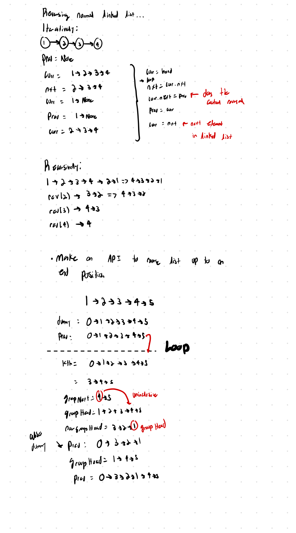 - When we reverse a segment, we are detaching it from the rest of the list because we are messing with our pointers so we need a way to reconnect the previous group to our reversed segment and our reversed segment to our next group