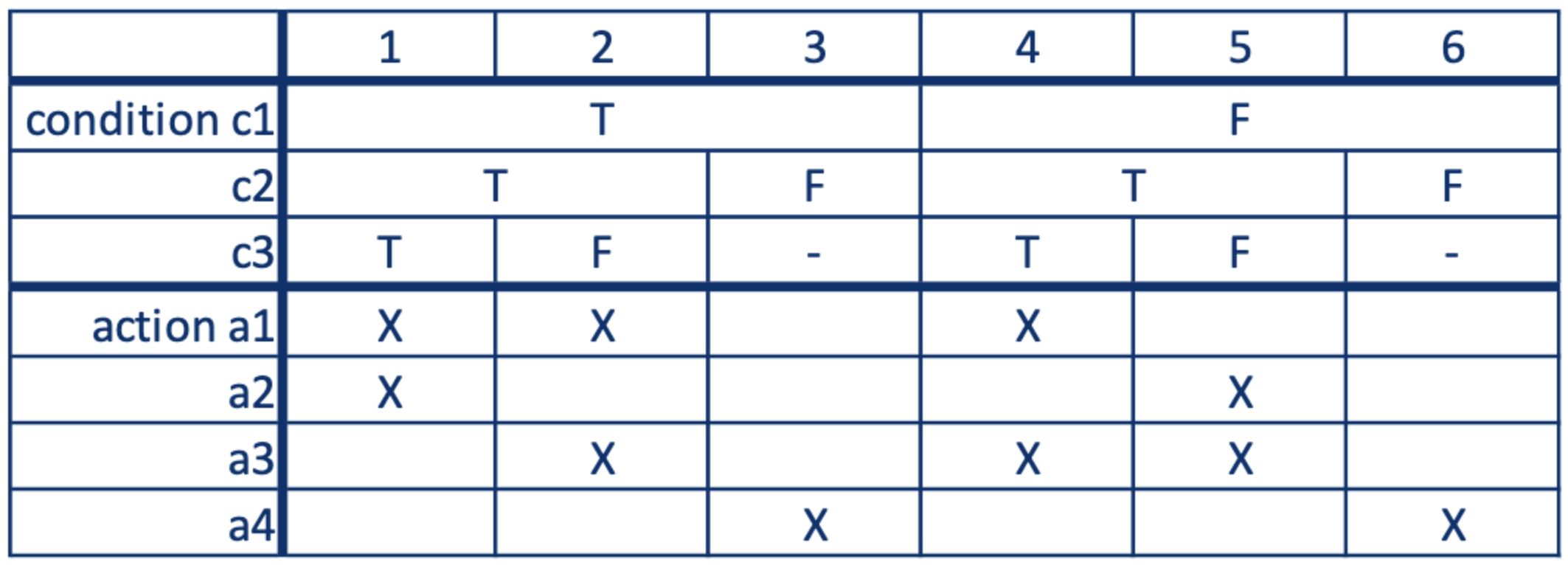 - A rule is a column in the table Don’t care values in decision tables help reduce the number of variants. We choose these for inputs that are necessary but have no effect, inputs that are emitted, and mutually exclusive cases.