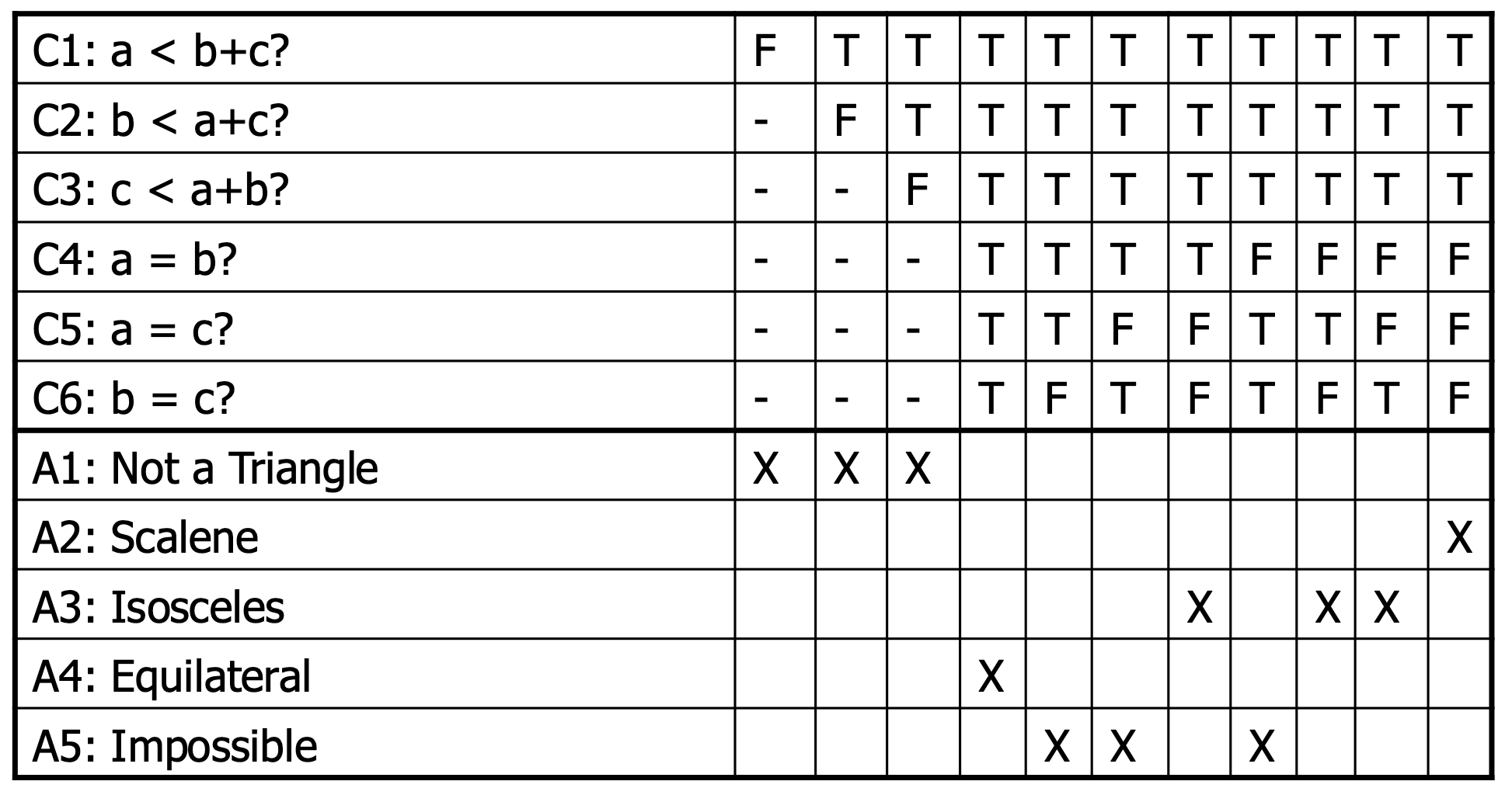 The condition entries in a decision table are interpreted by a computer program as inputs or equivalence classes of inputs. Each action in the table are interpreted as outputs. Each rule is then, a test case.