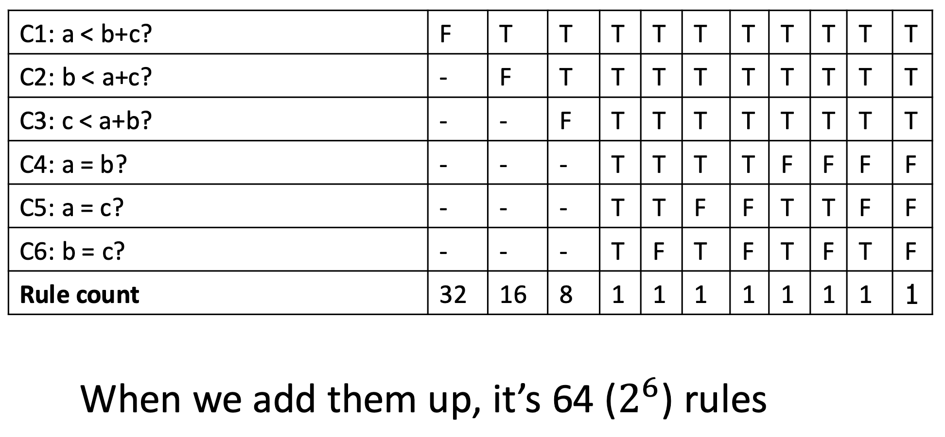 Don’t care entries reduce the number of explicit rules by implying that there are non-explicit rules. Each don’t care doubles the count for the rule. Then, we want to determine the corresponding rule count for each rule and total them. (If its don’t care, instead of T or F, its 2 instead of 1).