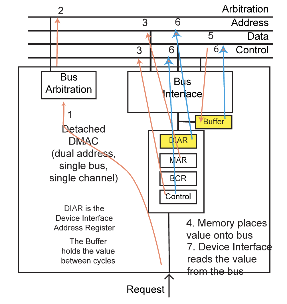 6,7. DMAC writes the data to the memory or the device depending on the direction of transfer