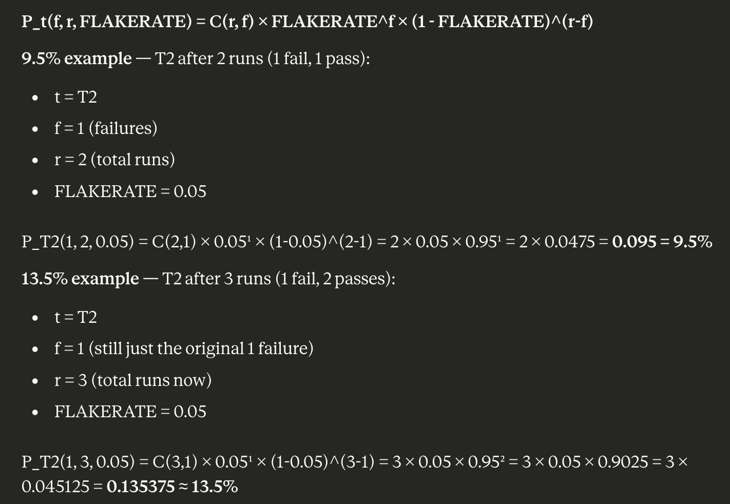 StableAccuracy = (TP+TN) / Runs = (FailWithFaults + PassNoFault) / Runs = Passes / RunsStableFlakeRate = (FP + FN) / Runs = 1 - Accuracy = (FailNoFault + Slipthrough) / Runs = Fails / Runs- Figure out how flaky your test are