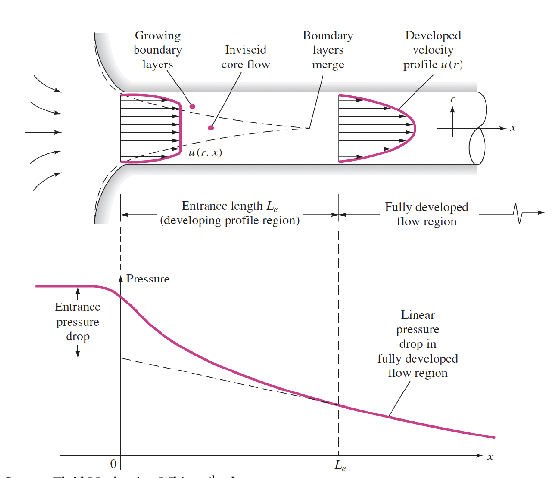 - Growth of viscous boundary layers means core flow needs to accelerate to satisfy continuity