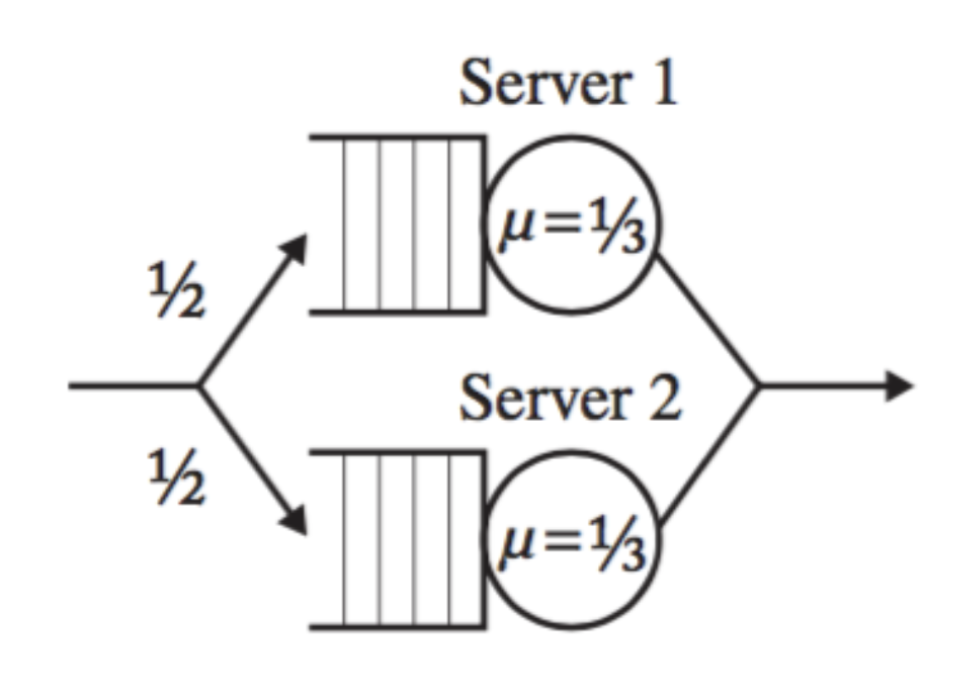 If we use an open system instead, then increasing the CPU throughput of one of the servers makes a large difference where it doesn’t in closed systems since the system will be bound by the slower server.